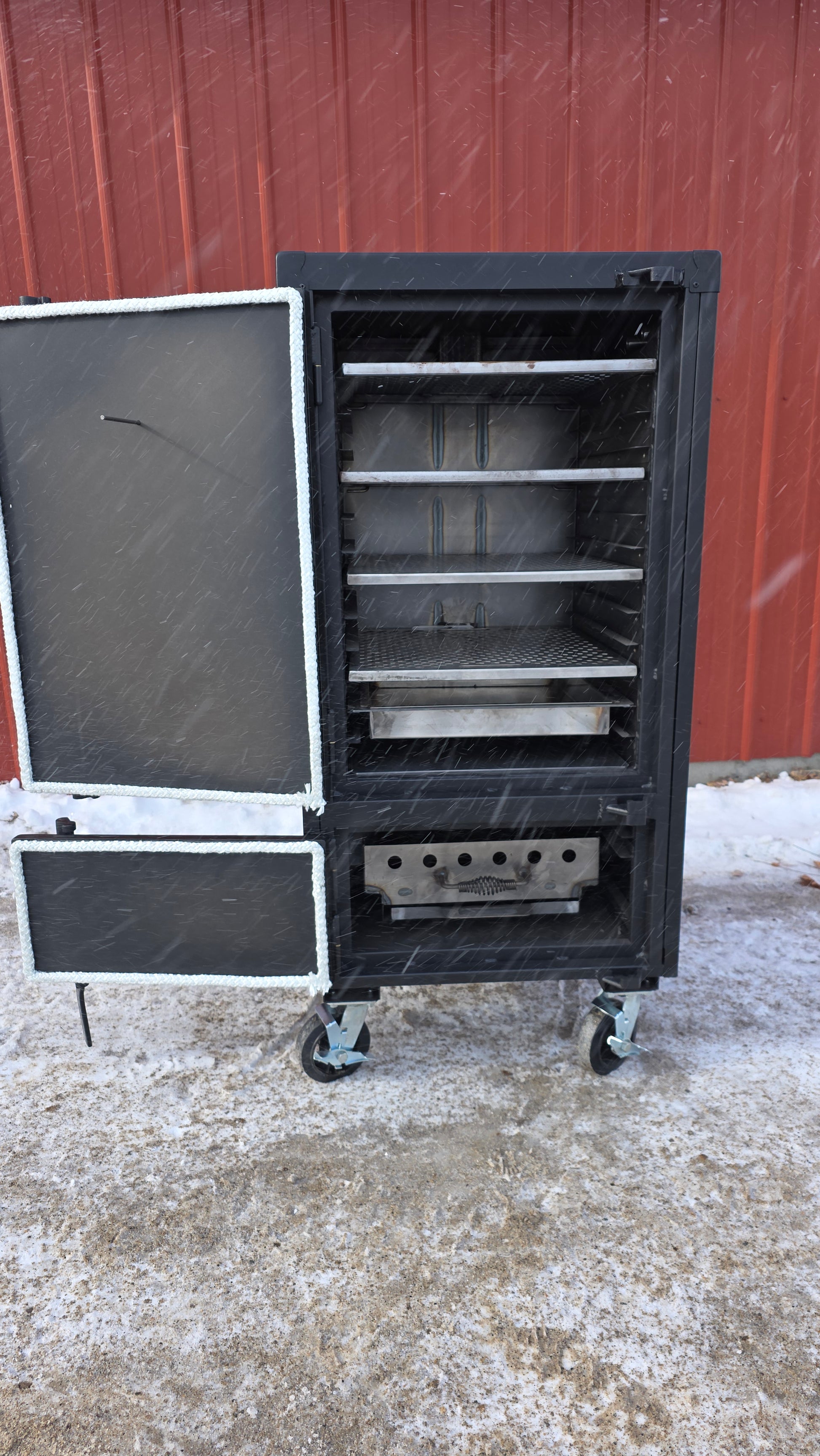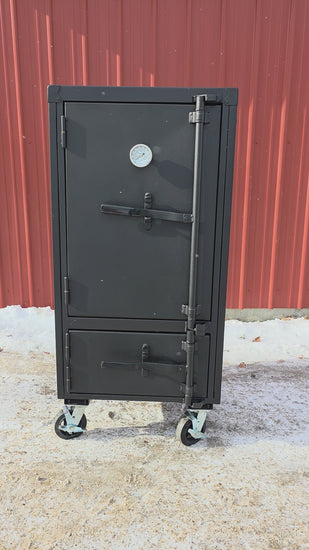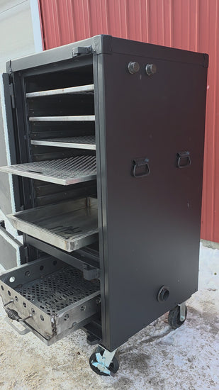 The Qube'd Beast is 6" wider than the DownEast Beast. The rack size is perfect to fit 4-6 pork butts or 3 St. Louis cut ribs and still maintain lots of airflow. Each Rack will hold one full size hotel pan and offers 2-1/2" of airflow on each side. This smoker was designed to cook a lot of food with a minimal foot print. These smokers feature the patent pending combo water pan.  The water pan can be used as a drop in, slide out or not at all (making this smoker a grill). These units come stock with 2" ball valves for air intake.  The solid firebox door creates a stylish and modern look as well as an airtight environment. .